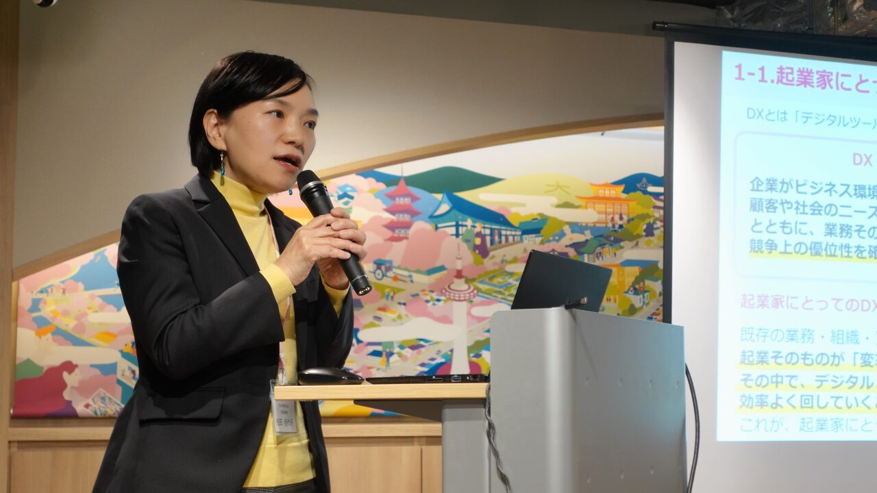 特別講師として、京都コンピューターシステム事業協同組合理事⾧、IT企業グループ「京なかGOZAN」代表を務める桂田 佳代子 さん(京なか株式会社 代表取締役)をお招きし、現代ビジネスに欠かせないIT/DX・SNSについて、お話しいただきました。